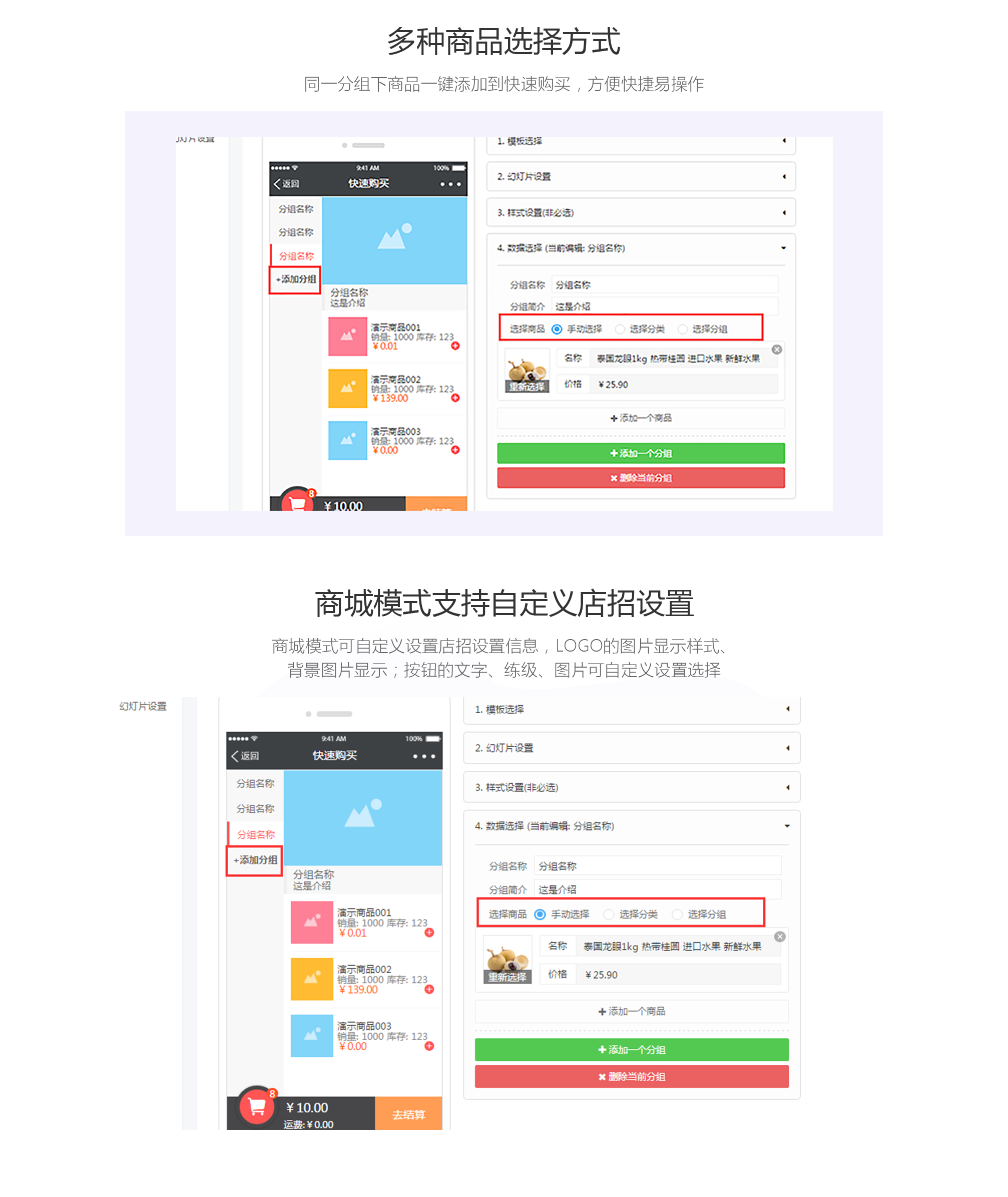 快速购买可为您实现商品快速浏览、购买,为商城用户提供便捷的操作购买体验。快速购买功能可提供多种模板模式,便于您选择设置,满足商城需求。